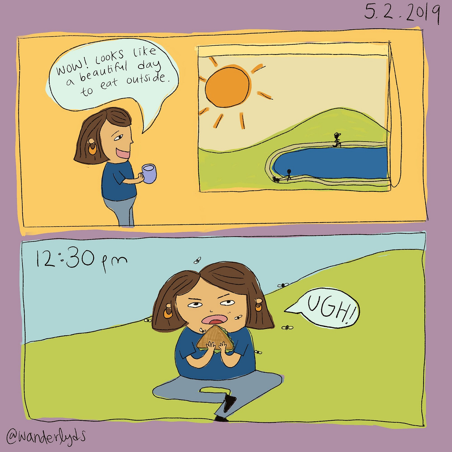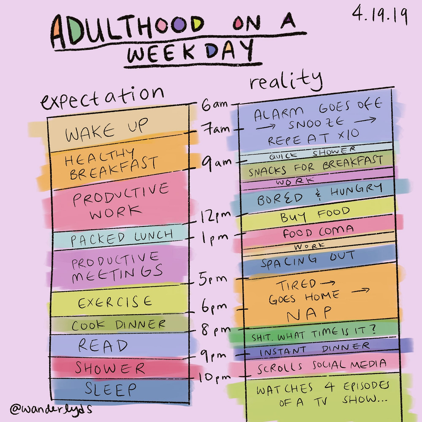 The biggest challenge I had initially, was coming up with what to draw. Over time, I had to start really noticing what I was doing everyday and see how I could turn it into a 1-panel comic. This was difficult given there were many days I felt like I didn't do anything. Which, on the other side of it, pushed me to really dig into the mundaneness of daily life. When I started creating from the mundane, I started to get comments and engagement from friends and strangers online about how relatable my work was. I remember feeling quite moved, because suddenly, my struggles felt less bad. Not only was I able to turn my struggles into something funny and relatable (comic relief for myself as I drew it out) but also I could tell more up close that others shared the same struggles. I also enjoyed that my coworkers and friends could discover this other part of me, in ways that I can't normally share (e.g. in lunch conversation or text).
